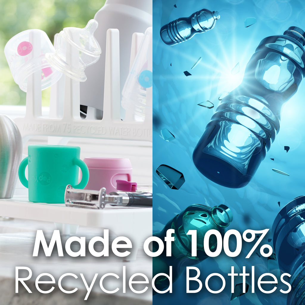 ✅ DRYING RACK - BEAUTIFUL SPACE SAVING DESIGN! PopYum’s Glacier White Space Saving Drying Rack is made of 100% recycled water bottles! Great for air drying everyday items like plastic bags, cups, baby bottles, tumblers and most items which are not dishwasher safe. The compact drying rack sits near the back of your counter, leaving the front counter area available for use.