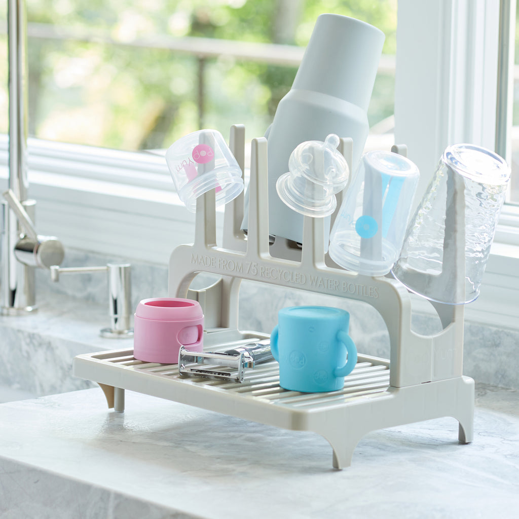 PopYum Pink Baby Bottle Set 4-Pack with Gray Drying Rack & Clear Drying Mat Bundle