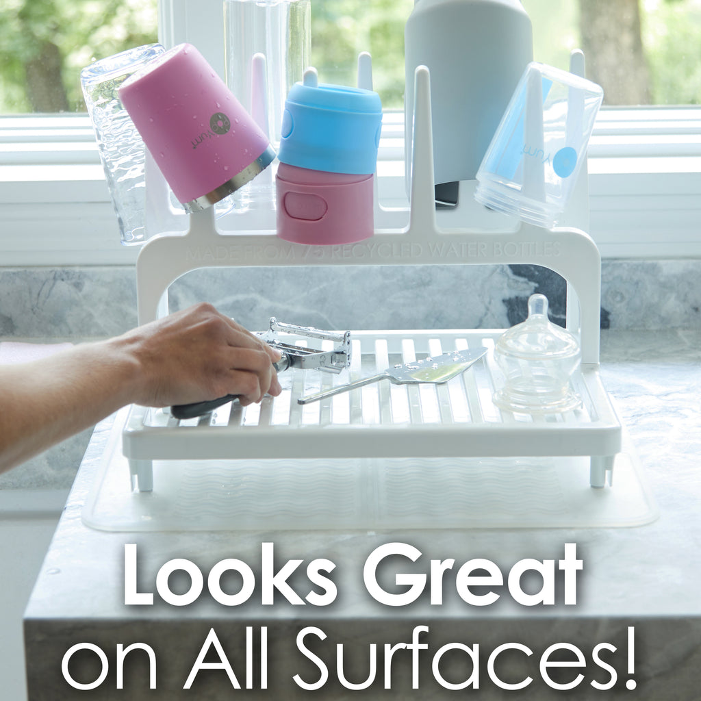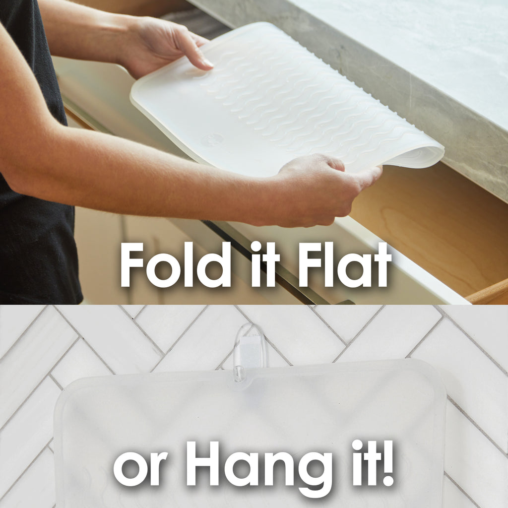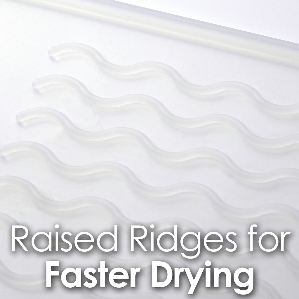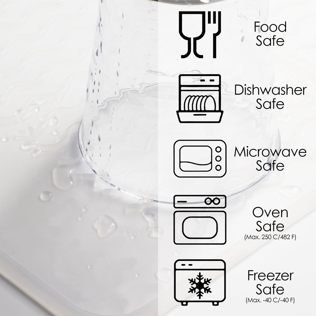 ✅ COMPLIMENTS EVERY COUNTERTOP! The silicone drying mat keeps moisture off of your counter and the clear frosted mat finish works with ALL countertop colors! Includes a 12x16 inch (30x40 cm) clear frosted 100% silicone drying mat.